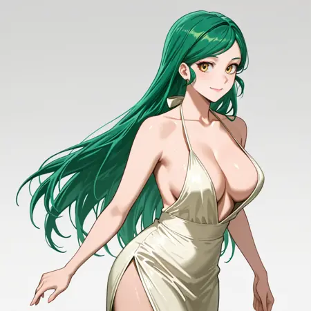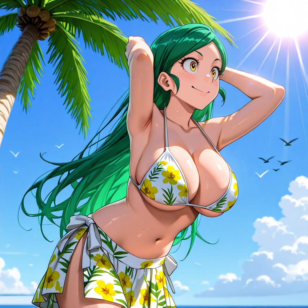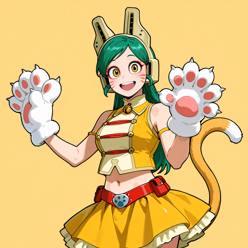 트리거: TomokoMHA, 1girl, 노란 고양이 꼬리, 치마, 흰색 발 장갑, 얼굴 무늬, 수염 무늬, 빨간 벨트, 복부, 녹색 머리, 배꼽, 동물 발, 노란 드레스, 고양이 발, 동물 귀, 카우보이 샷