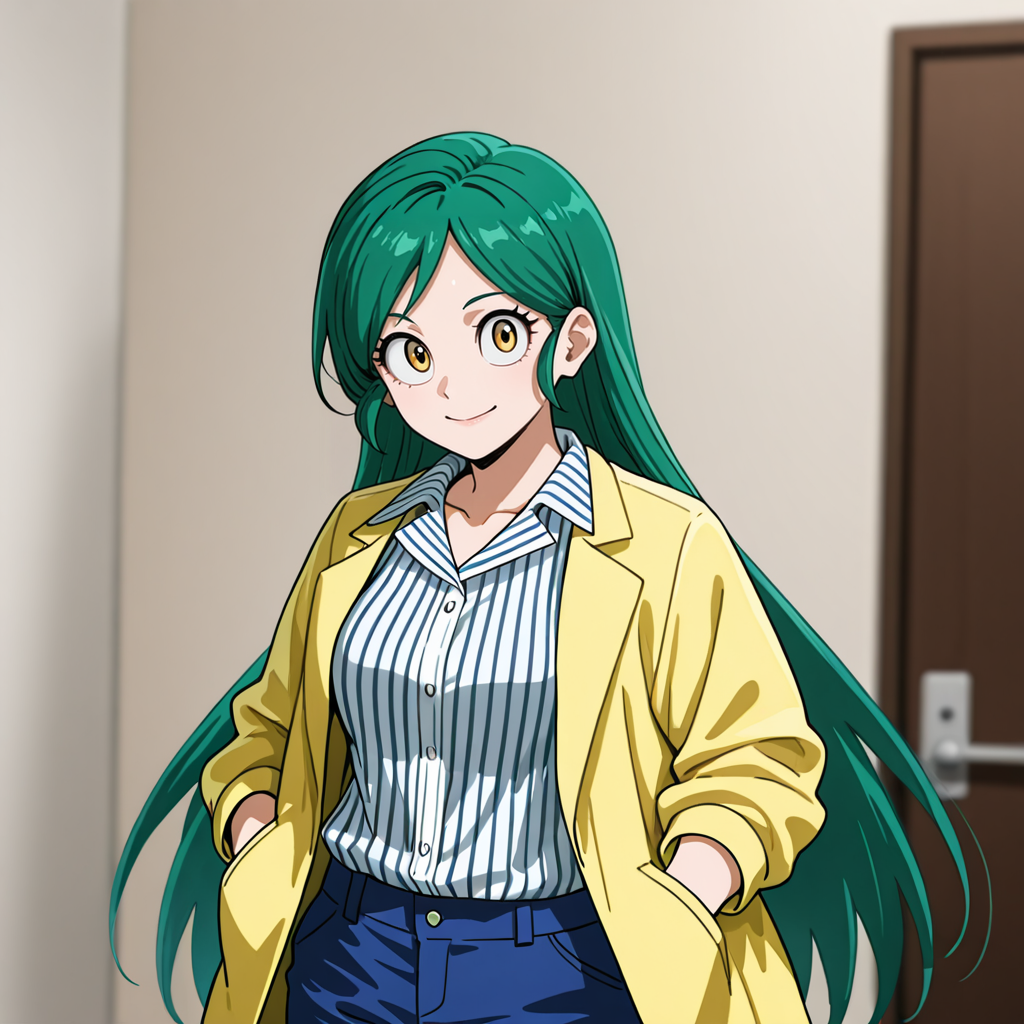재킷 포함 트리거: TomokoMHAJacket, 1girl, 줄무늬 셔츠, 노란 눈, 긴 머리, 녹색 머리, 파란 바지, 연한 노란 재킷, 카우보이 샷