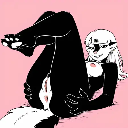 skunk, skunk girl, black and white fur, white hair, blunt bangs, black eyes, pink nose, skunk ears, skunk tail, medium breasts, earrings,