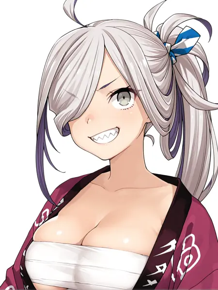 トリガーワード ・d_d_asashimo_s,ahoge,ponytail,grey eyes,grey hair,sharp teeth,