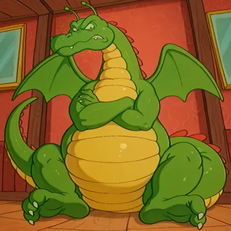 タグ: ドラゴン、緑色の体、黄色の腹部、赤いトゲ、触角、翼、牙、下重型、半人間