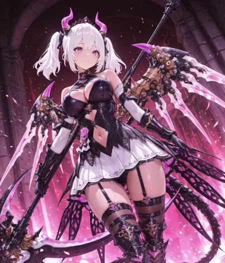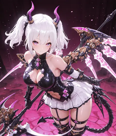 过膝长筒袜、角、服装镂空、尾巴、机械翅膀、白色短裙、靴子、吊袜带、黑色手套、裸露肩膀、盔甲、护手、黑色连衣裙、肚脐镂空、胸脯镂空、手持武器、镰刀、武器、白发、短发、双马尾