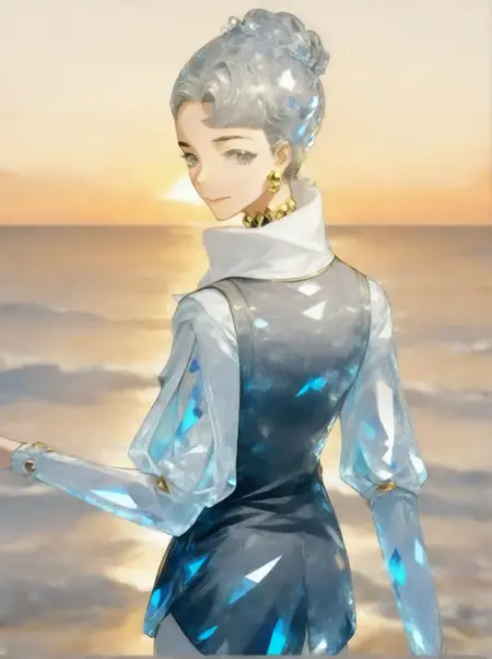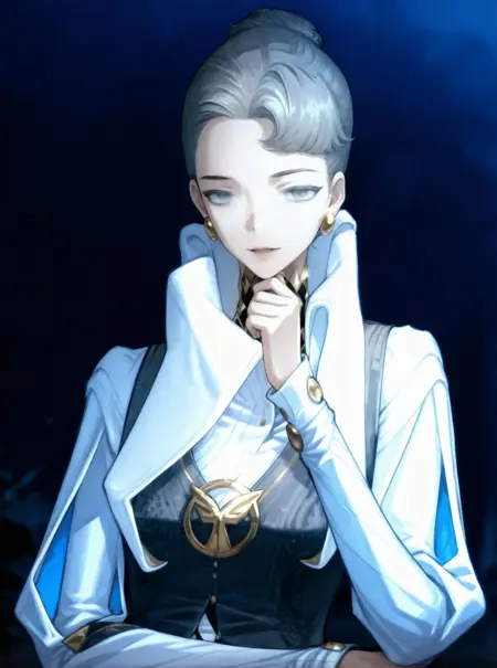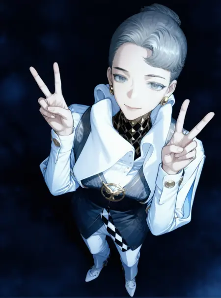 트리거 단어: kansitanding, 1girl, 회색 머리카락, 단일 머리 땋기, 앞머리, 회색 눈, 금 귀걸이, 금 목걸이, 흰색 칼라 셔츠, 회색 조끼, 줄리엣 소매, 흰 바지, 하이힐, 흰 신발