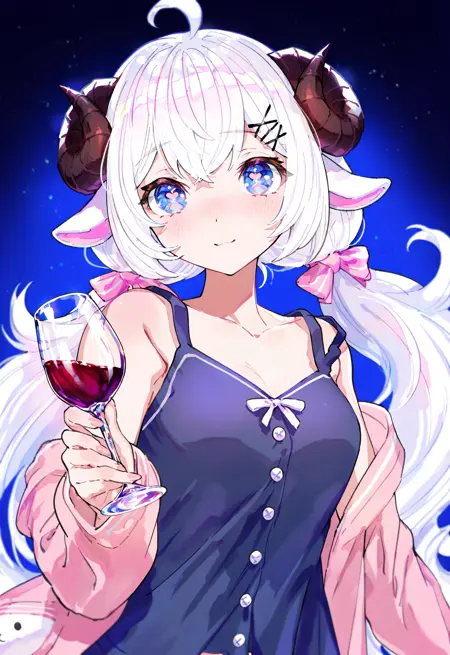 DollieHitsujida, white hair, twintails, ahoge, horns, sheep ears, blue eyes, heart shaped pupils, hair ribbons, x hair ornament