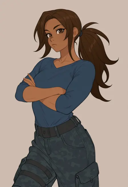 キャラクタータグ:肌の黒い女性、茶色の目、茶色の髪、長い髪、ポニーテール