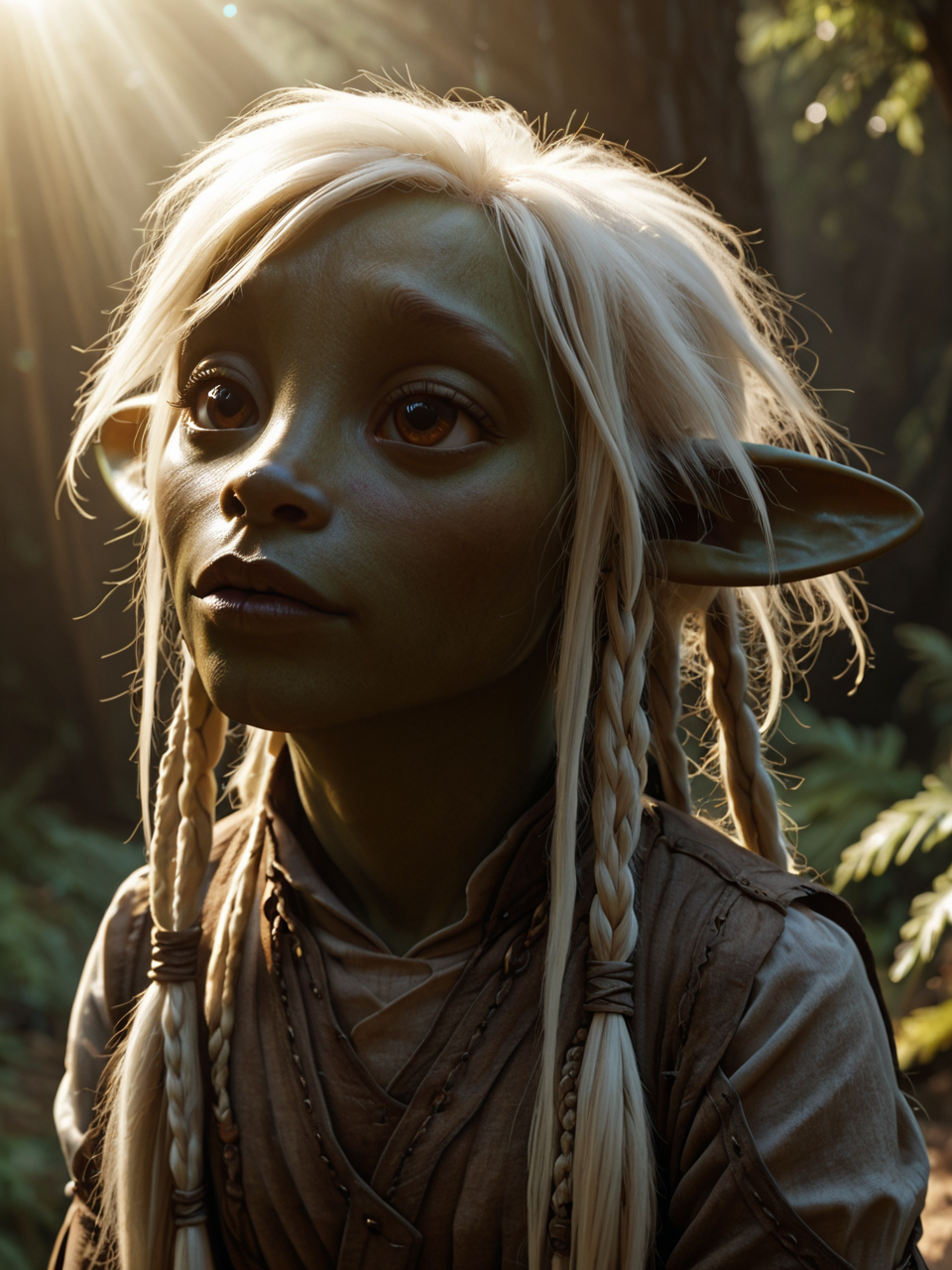 D33t, 1girl, solo, long hair, brown eyes, white hair, pointy ears, colored skin, multiple braids,