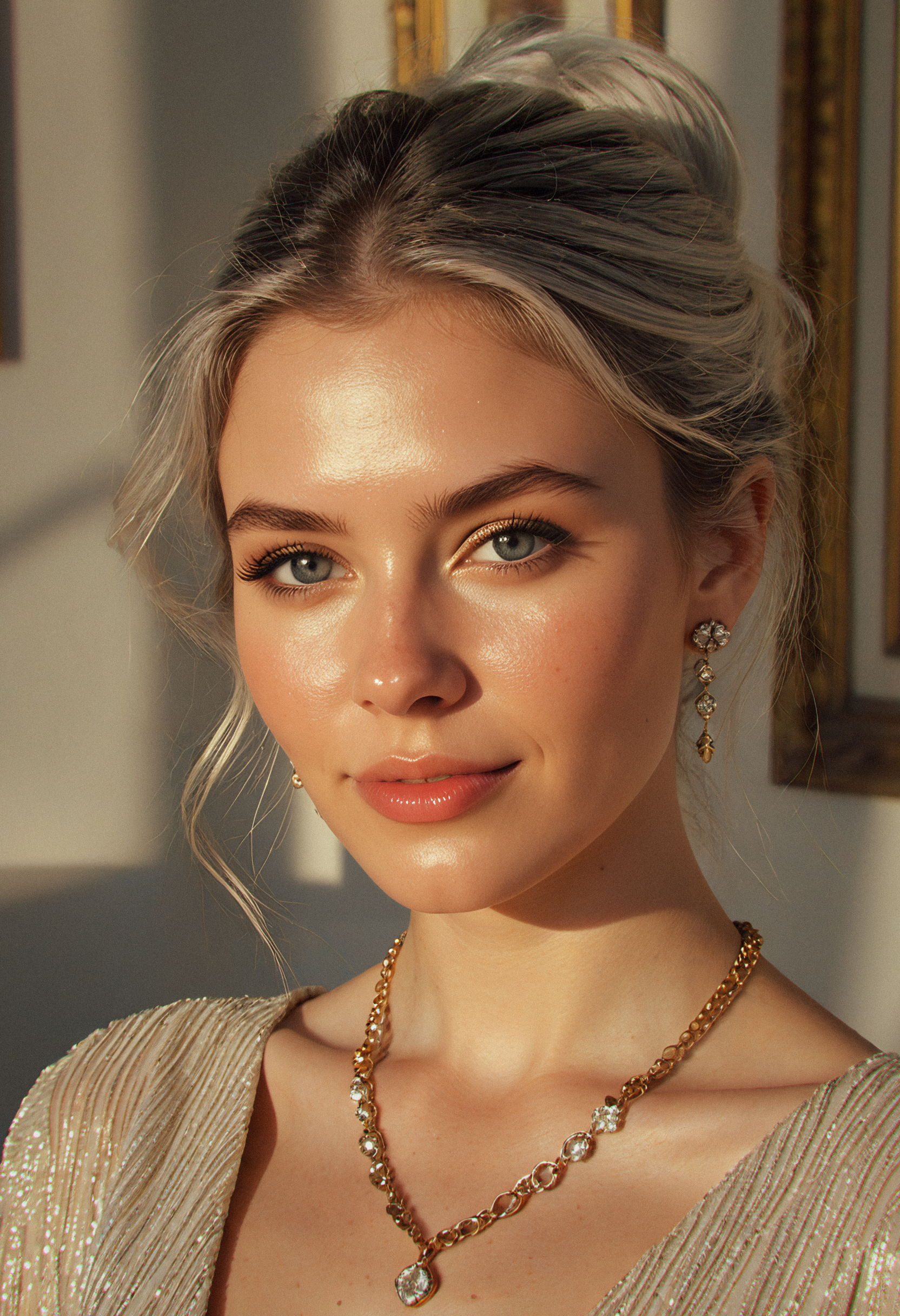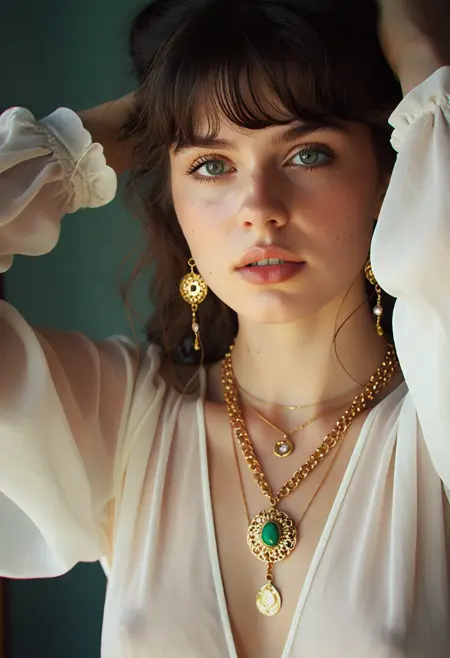 (EW) 우아한 여성: 골든 아워에 캡처된 LoRA. 따뜻한 측면 조명, 부드러운 그림자, 고귀한 직물, 그리고 당신을 직시하는 눈. 하이 패션 및 에디토리얼 초상화에 완벽합니다.
