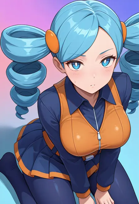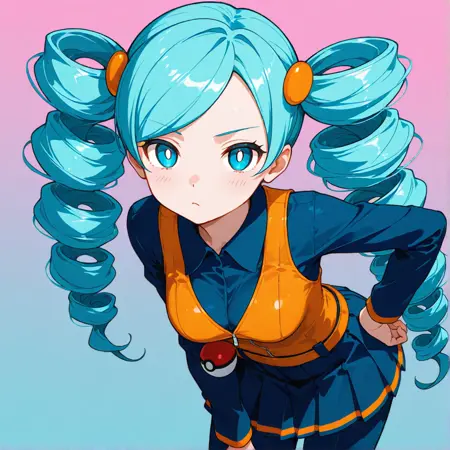 bwace, ace trainer \(female\) \(pokemon bw\), long hair, blue hair, bangs, blue eyes, white pupils, hair ornament, drill hair, twin drills,