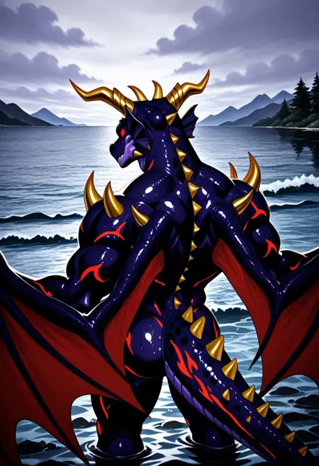 강화 프롬프트: "비늘, 비늘 피부, 드래곤, 가시 꼬리, 붉은 눈, 빛나는, 붉은 무늬, 붉은 날개"