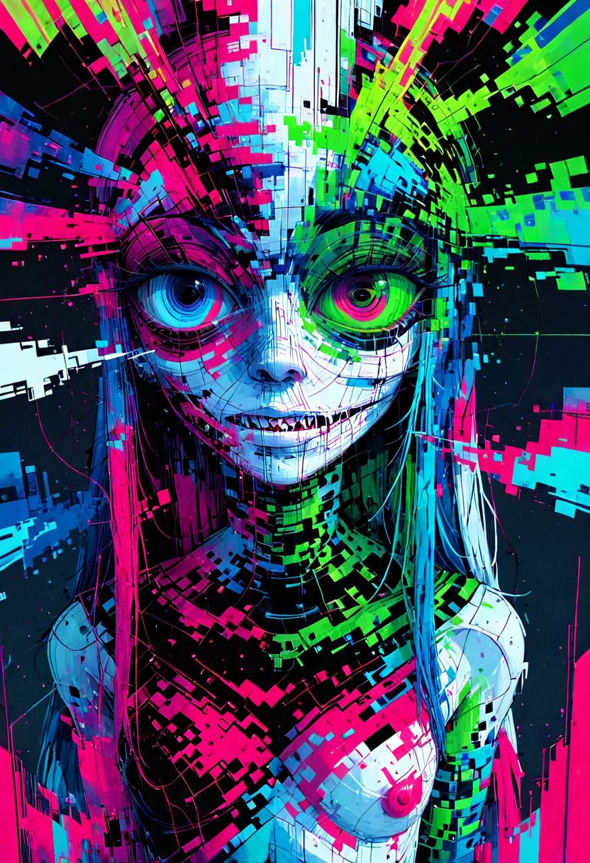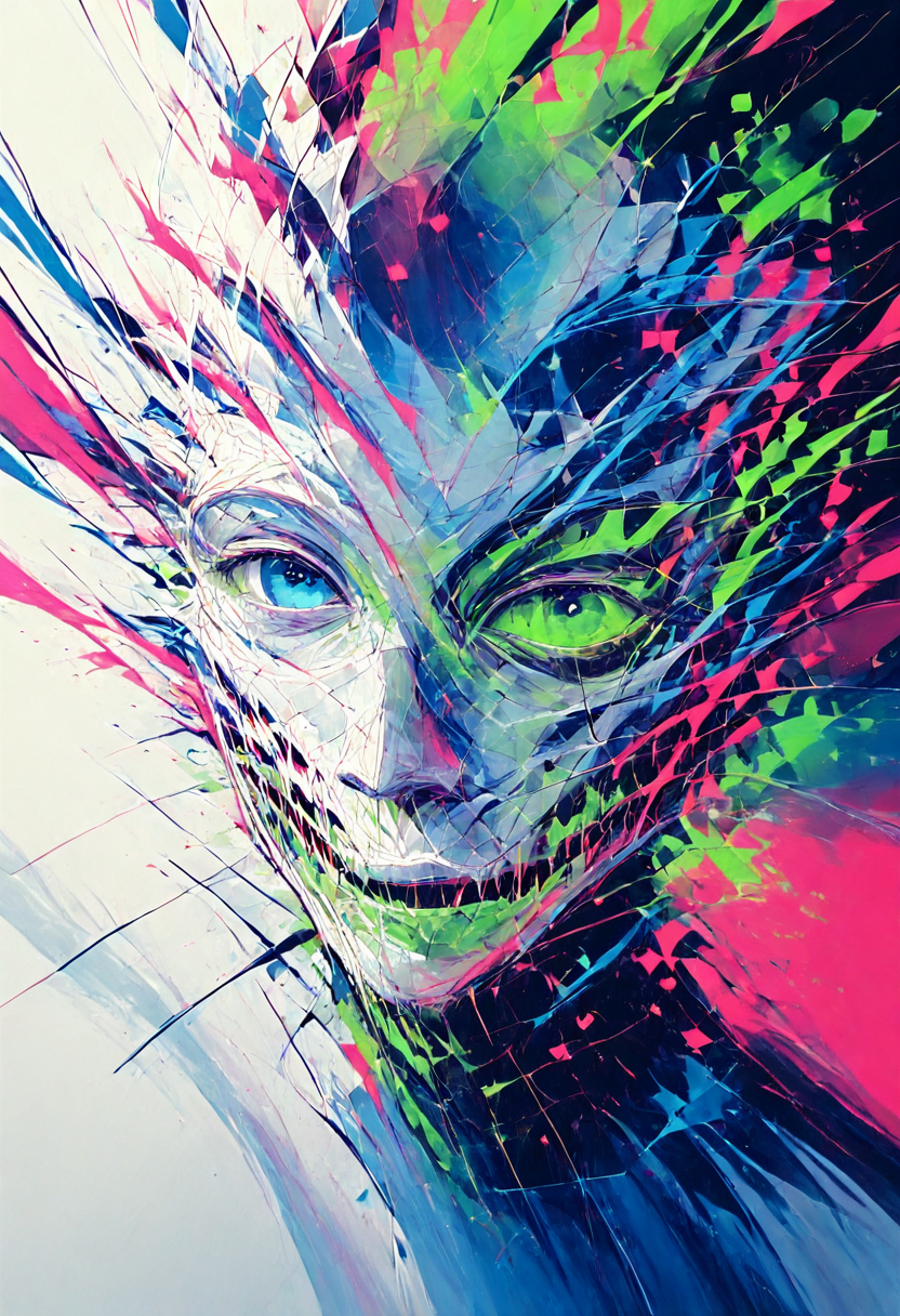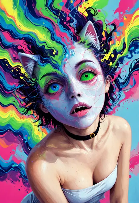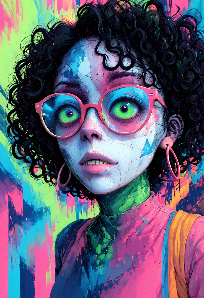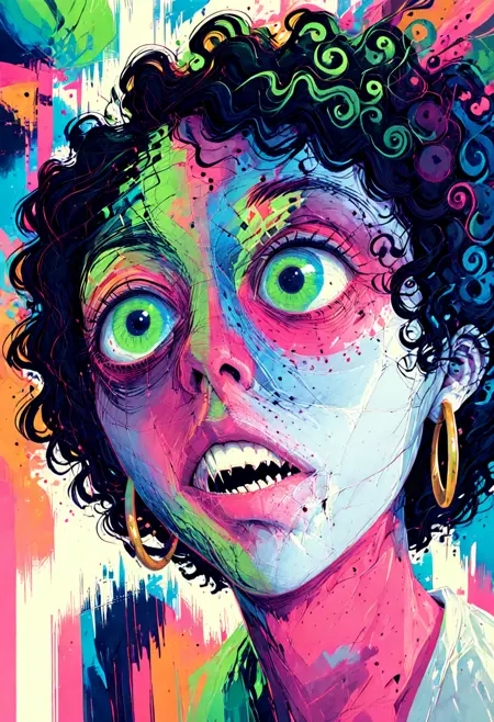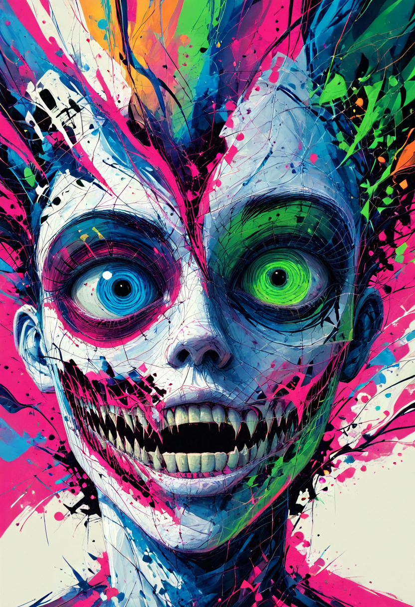Chroma Fracture // PSYCHEDELIC - SDXL LoRA Style generates images in a style of neon horror fused with abstract art deco. It blends terrifying, distorted, or monstrous facial features (sharp teeth, enormous eyes) with a vibrant, explosive color palette - neon pink, blue, green, and purple. Characteristic elements include dynamic paint splatters, geometric cracks across skin, and hypnotic, almost acid-like background patterns. The aesthetic resembles digital painting, where horror and beauty merge into one energetic, visually aggressive composition