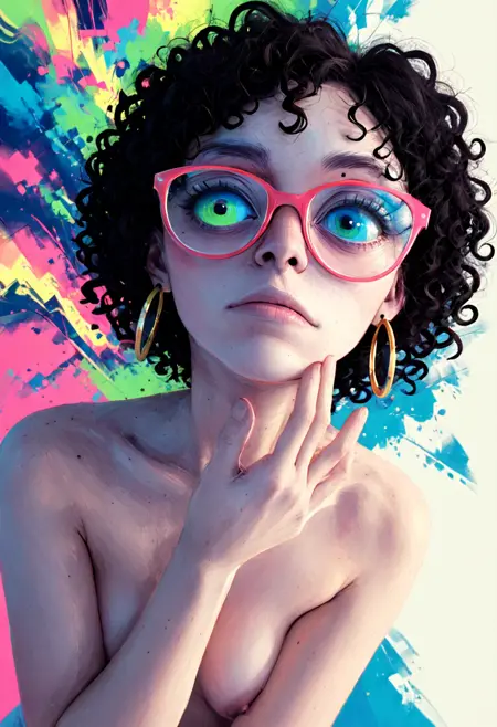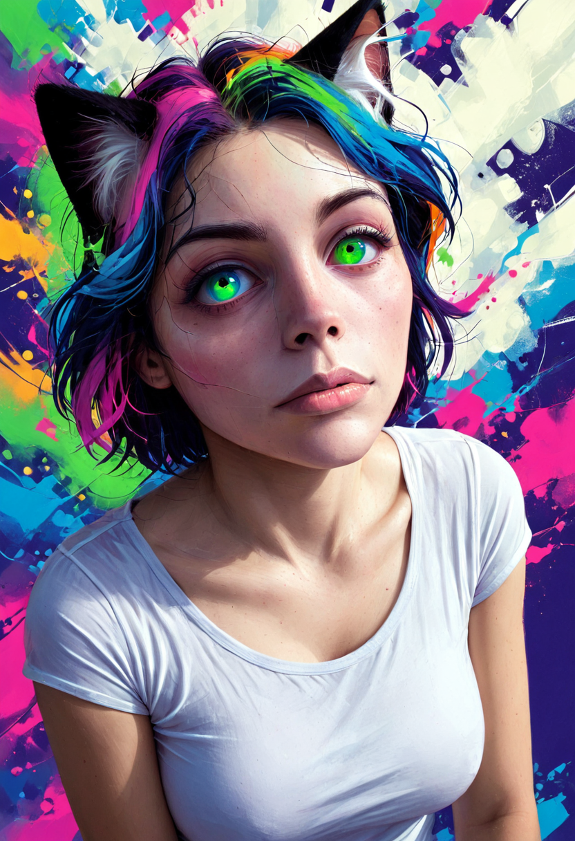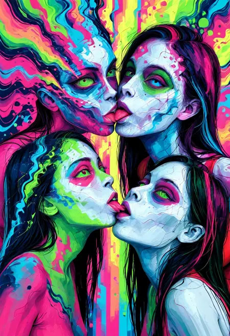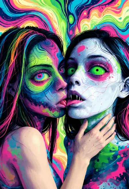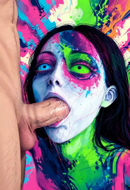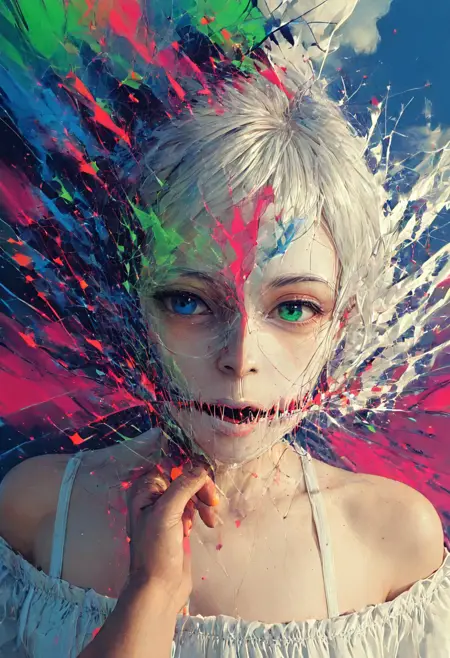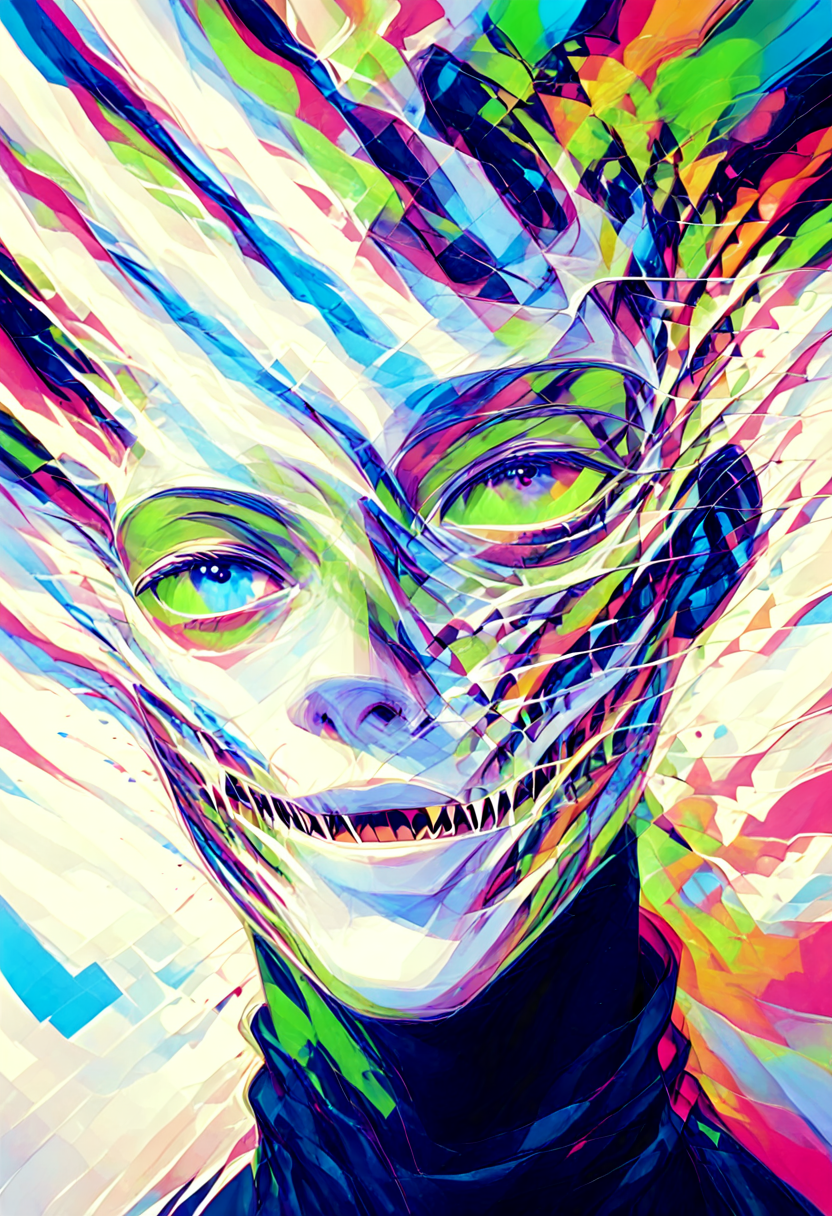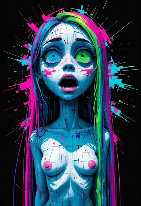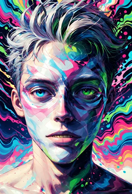 Chroma Fracture // PSYCHEDELIC - SDXL LoRA Style generates images in a style of neon horror fused with abstract art deco. It blends terrifying, distorted, or monstrous facial features (sharp teeth, enormous eyes) with a vibrant, explosive color palette - neon pink, blue, green, and purple. Characteristic elements include dynamic paint splatters, geometric cracks across skin, and hypnotic, almost acid-like background patterns. The aesthetic resembles digital painting, where horror and beauty merge into one energetic, visually aggressive composition