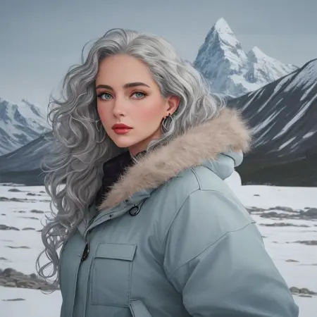 - 초상화, 유혹적인 여성, 보통 키, 날씬한, 둥근 얼굴, 어두운 피부, 대나무색 머리카락, 청보라색 눈, 눈이 굽어진 코, 두꺼운 입술, 두드러진 턱, 어깨 길이 머리카락, 곧은 머리카락, 옆으로 스치는 앞머리, 비대칭 가슴, 페이크 게이지 귀걸이, 은색, 투명한 립스틱, 부드러운 재킷, 가는 청바지, 눈 신발, 가까이 구경하는 자세, 환경 조명, 패턴