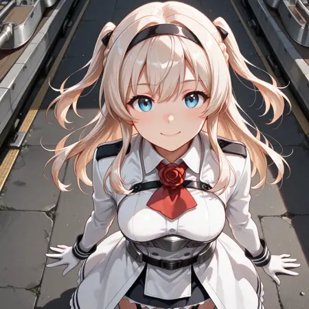 military uniform, white military coat,standing collar, red rose ascot,black miniskirt,petticoat,garter straps,thighhighs,white gloves,rudder footwear