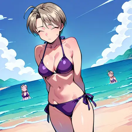 mitsune, 1girl, solo, 腹部露出, 目を閉じている, ジュエリー, へそ, ピアス, 肩を露出, 茶色の髪, 短髪, クロップトップ, h outfit