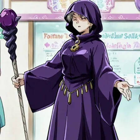 mitsune, 1girl, staff, 長袖, フード, solo, ドレス, マント, ジュエリー, ローブ, 持っている, 広い袖, 占い師