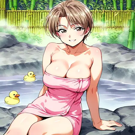 mitsune, 1girl, 裸のタオル, 温泉, solo, タオル, 茶色の髪, 短髪, ラバーダック, 竹, 胸, 茶色の目, 大きな胸, 胸元の露出, 肩を露出, 水