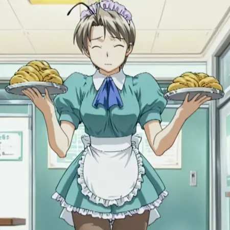 mitsune, solo, メイド, 食べ物, エプロン, 触角, 男性の衣装を着る, 目を閉じている, パンツィーストッキング, 1boy, 1girl, 短髪, ウェイトレス, ドレス, メイドの帽子, 茶色の髪