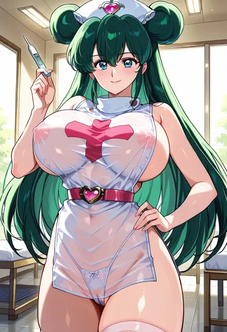MagicalNurseMaina, 1980s \(style\), retro artstyle, 1girl, solo, green hair, long hair, double bun, hair between eyes, blue eyes, eyelashes, mature female, adult female, huge breasts, curvy, narrow waist, wide hips, curvy hips, white nurse dress, white nurse cap, covered nipples, pink heart shape belt buckle, pink belt, see-through clotes, sideboob, blush, white micro skirt, cameltoe, highleg thong panties, white thigh-high stockings, dark blue shoes, heels,