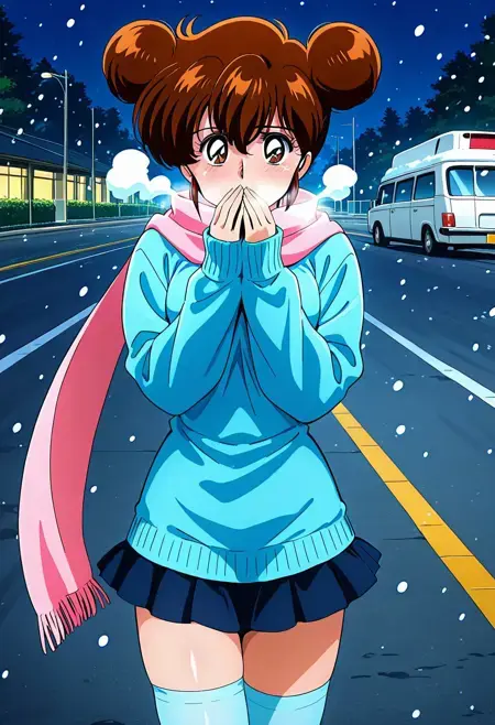 MainaSannomiyaWinter, 1980s \(style\), retro artstyle, 1girl, solo, brown hair, double hair bun, short hair, hair between eyes, brown eyes, medium breast, narrow waist, large hip, pink scarf, blue sweater, long sleeves, dark blue miniskirt, zettai ryouiki, blue thighhighs, dark blue shoes,