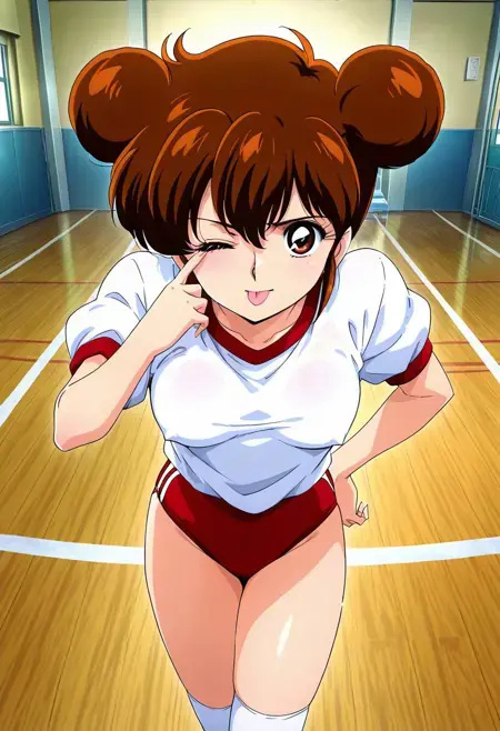 MainaSannomiyaBuruma, 1980s \(style\), retro artstyle, 1girl, solo, brown hair, double hair bun, short hair, hair between eyes, brown eyes, medium breast, narrow waist, large hip, white gym shirt, short sleeves, covered nipples, covered navel, red buruma, skindentation, gym uniform, white kneehighs socks, white sneakers,