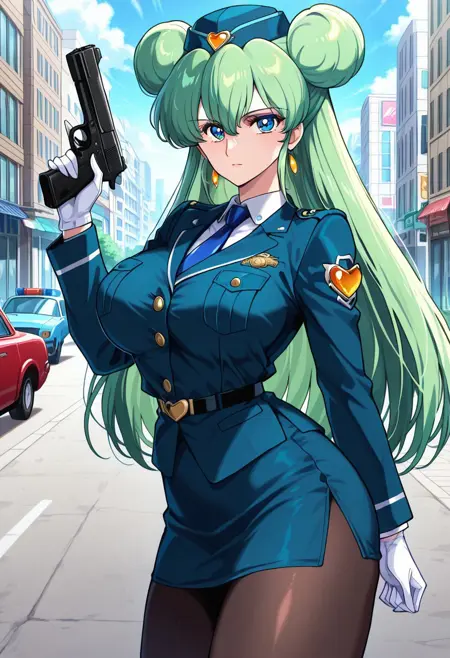 MagicalNurseMainaPolice, 1980s \(style\), retro artstyle, 1girl, solo, green hair, long hair, double bun, hair between eyes, blue eyes, eyelashes, mature female, adult female, huge breasts, curvy, narrow waist, wide hips, curvy hips, garrison cap, golden heart ornament on cap, japanese female police uniform, formal, pink heart ornament, jewelry, dark blue bowtie ribbon, dark blue jacket, long sleeves, white shirt, covered navel, dark blue pencil miniskirt, black pantyhose, weapon, gun, holding gun, holding weapon, high heels, dark blue shoes,