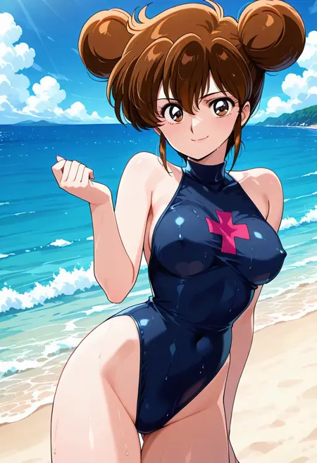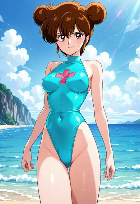 MainaSannomiyaSwimsuit, 1980s \(style\), retro artstyle, 1girl, solo, brown hair, double hair bun, short hair, hair between eyes, brown eyes, medium breast, narrow waist, large hip, covered nipples, turtleneck, halterneck, bare shoulders, blue one-piece swimsuit, highleg, print swimsuit, printed pink cross, covered navel, impossible swimsuit, thigh gap, groin, barefoot,