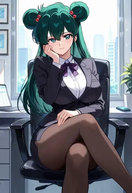 MagicalNurseMainaOffice, 1980s \(style\), retro artstyle, 1girl, solo, green hair, long hair, double bun, hair between eyes, blue eyes, eyelashes, mature female, adult female, huge breasts, curvy, narrow waist, wide hips, curvy hips, black jacket, dark purple bowtie, white collared shirt, black pencil miniskirt, office lady, formal suit, pantylines, black pantyhose, high heels, black shoes,