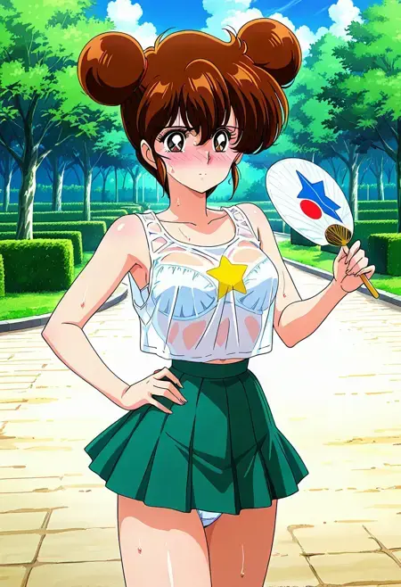 MainaSannomiyaSummer, 1980s \(style\), retro artstyle, 1girl, solo, brown hair, double hair bun, short hair, hair between eyes, brown eyes, medium breast, narrow waist, large hip, white panties, holding hand fan, uchiwa, fanning self, blush, sleeveless, white tank top with star pattern, see-through clothes, sweat, green pleated skirt, miniskirt, white socks, brown shoes,
