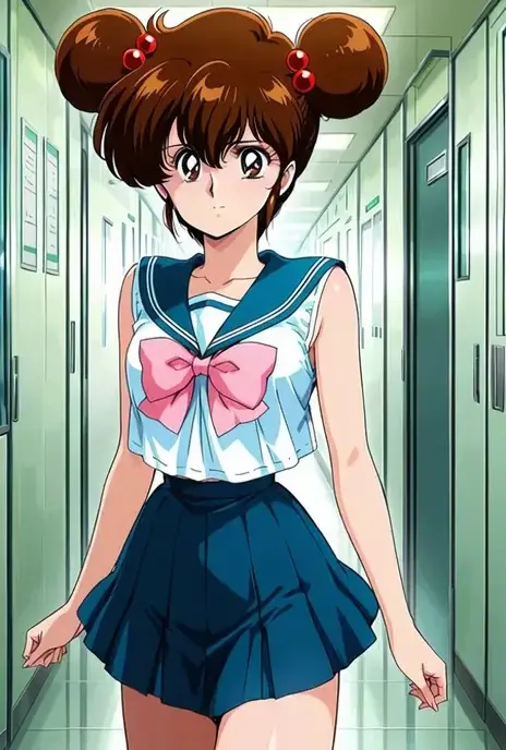 MainaSannomiyaNormal, 1980s \(style\), retro artstyle, 1girl, solo, brown hair, double hair bun, short hair, hair between eyes, brown eyes, medium breast, narrow waist, large hip, green hair bobbles, hair ornament, serafuku, school uniform, white blouse, blue plaited miniskirt, pink bow, sailor senshi uniform, blue sailor collar, sleeveless, white socks, brown shoes,