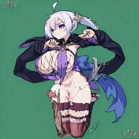 kunoichi sekiren, , white hair, purple eyes, ponytail, black sleeves, purple bra, blue bow, tatoo on pussy, fishnet thighhighs, brown thighhighs, bandage socks,