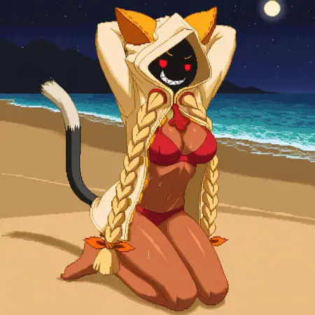 kakabb, taokaka, 猫娘, 顔が影に隠れている, 赤い目, 濃い肌, 二つ編み, 金髪, オレンジ色の髪リボン, 猫の尾, 動物型フード, 偽の動物の耳, 黄色のフーディー, 赤い大きなジッパー, 金ボタン, 赤いパンツ、黄色のレッグウォーマー, 黒いハイヒールブーツ
