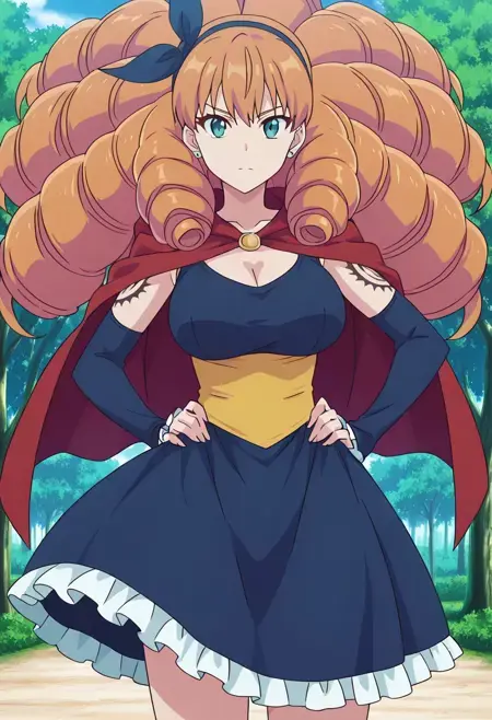 MelieCas, 1girl, solo, orange hair, long hair, curly hair, drill hair, green eyes, large breasts, earrings, cleavage, blue dress, detached sleeves, hairband, holding wand, red capelet, magic, hair ribbon, frills, jewelry, ribbon, tattoo on shoulder, tattoo on arm, tattoo thigh, frilled skirt dress, no socks, dark blue shoes,