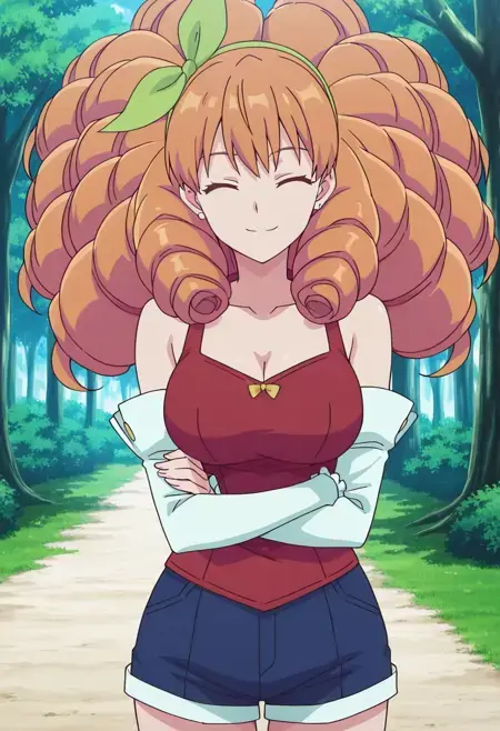 MelieCasAlter, 1girl, solo, orange hair, long hair, curly hair, drill hair, green eyes, large breasts, earrings, red shirt, cleavage, cleavage, detached sleeves, bare shoulders, blue shorts, ribbon, hair ribbon, no socks, dark blue shoes,