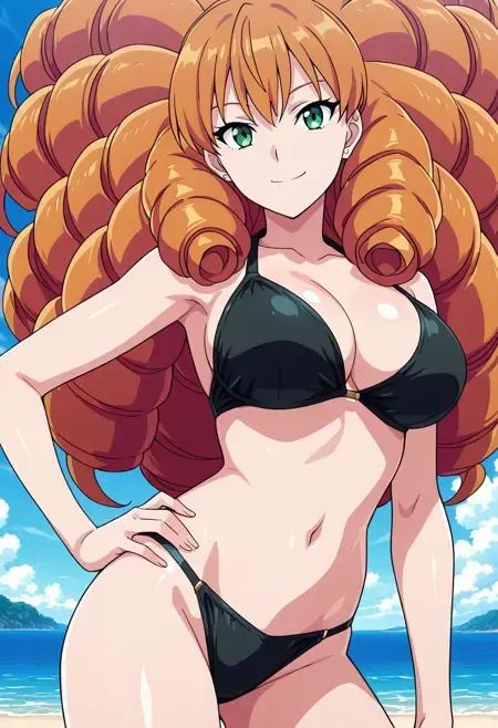 MelieBikini, 1girl, solo, orange hair, long hair, curly hair, drill hair, green eyes, large breasts, black bikini, black bikini top, thong panties, bare feet,