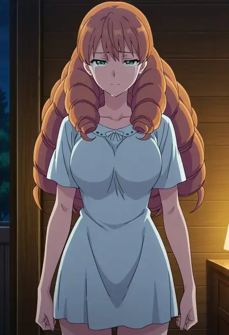 MeliePajamas, 1girl, solo, orange hair, long hair, curly hair, drill hair, green eyes, large breasts, white dress, bare feet,