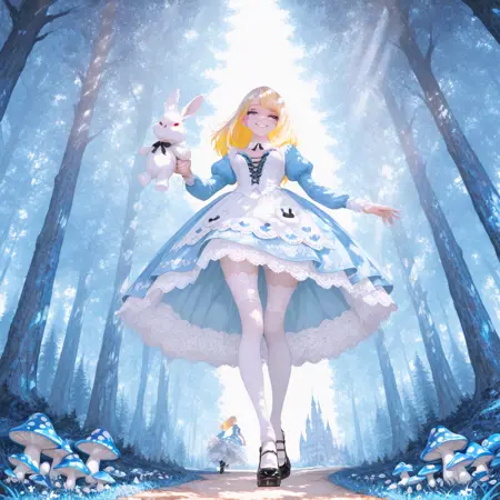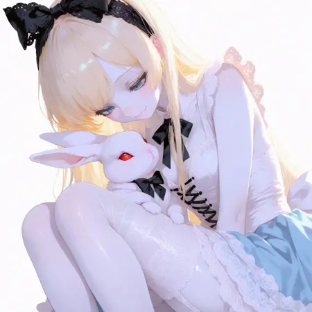 (アリス・イン・ワンダーランド: 1,2),(金髪: 1,3),(青い瞳: 1,2),(蒼い肌: 1,1),(フリル付きの白いドレス: 1,2),(リボン付きの黒いヘアバンド: 1,2),白いウサギを抱え、見下ろし、少し微笑む,(ソフトな照明: 1.3),(詳細な顔の特徴: 1.3),(若い: 1.1),(胸が大きい: 1.1),座っている,クローズアップ,アニメスタイル,ソフトな色調,パステルカラー,夢幻的な雰囲気,pixivのイラスト,高解像度,デジタルイラスト,鮮明な焦点,(詳細な白いウサギ: 1.2),ストッキングのレース,白い背景,(繊細な詳細: 1.2)