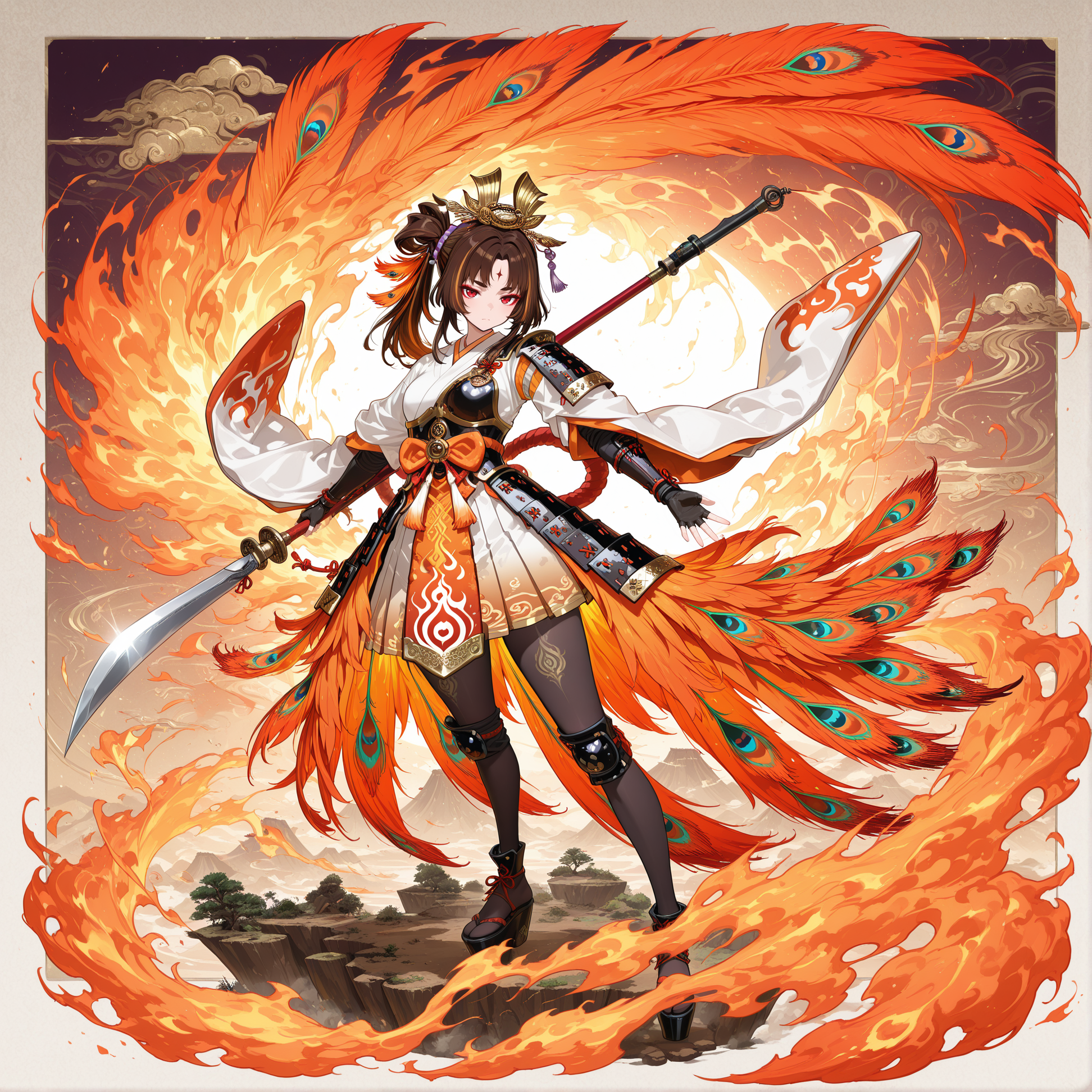 手持长柄武器,薙刀,战斗姿势,火焰武器,严肃,火焰,能量,凤凰,