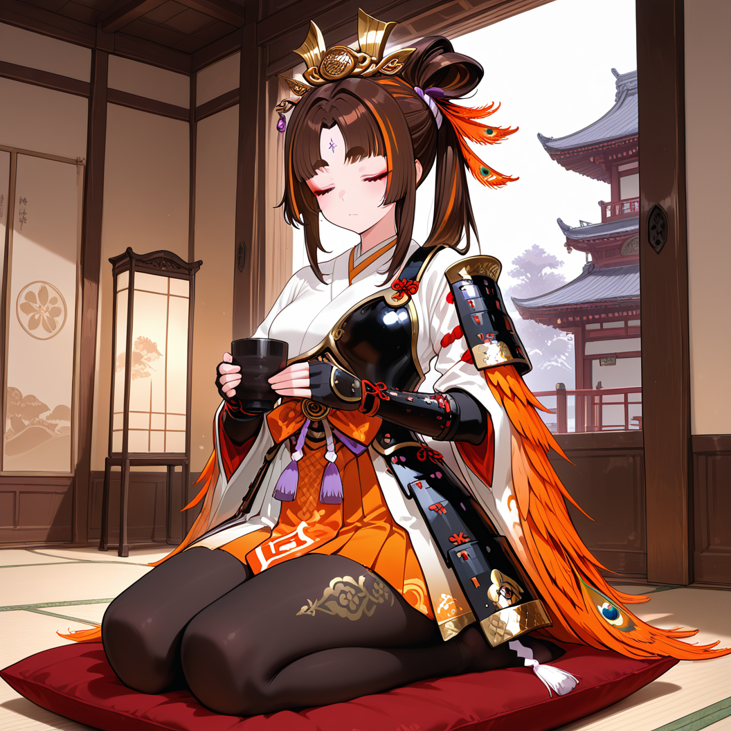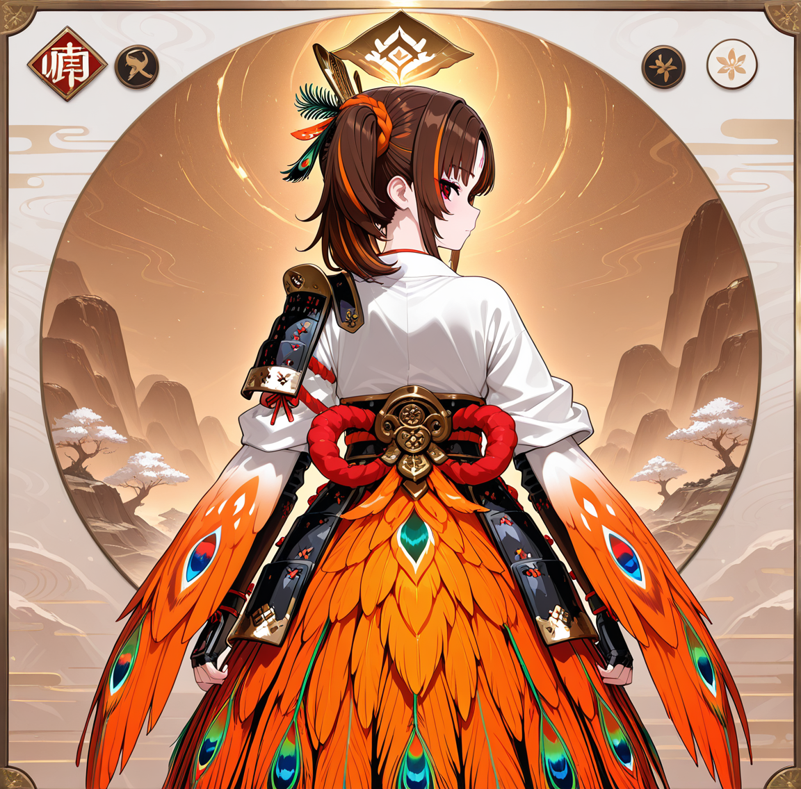 和服,白色和服,白色裙子,高低裙摆,袖子,宽袖,镶羽毛袖子,迷你裙,羽毛裙,橙色羽毛,日本铠甲,金色镶边,裙甲,单肩护甲,臂甲,露指手套,黑色连裤袜,印花连裤袜,火焰印花,护膝,厚底鞋,
