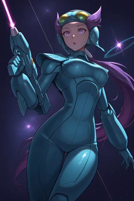 彼女の典型的な外見には、「薄い青色のヘルメット、頭にゴーグル、タートルネック、胸元の切り替え、薄い青色のジャンプスーツ、長袖、白い手袋、白いズボン、薄い青色の靴」を追加してください。