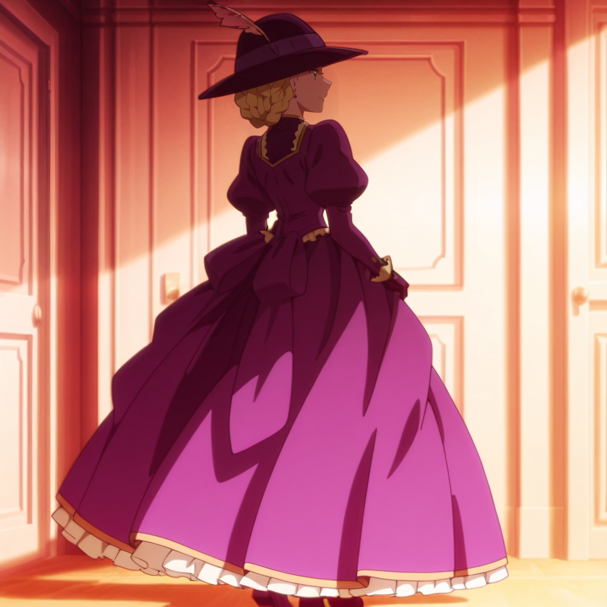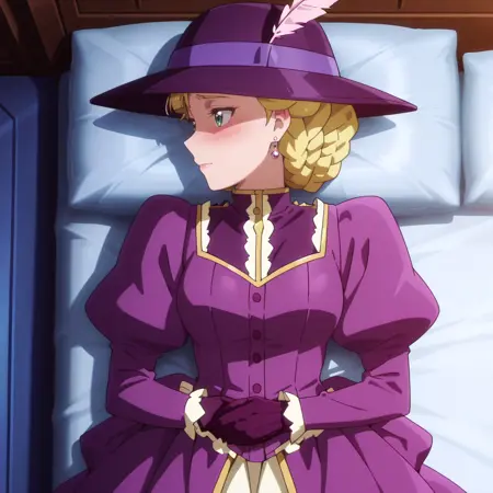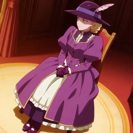 dress, jewelry, long sleeves, puffy sleeves, purple dress, hat, gloves, hat feather, juliet sleeves, purple headwear,
