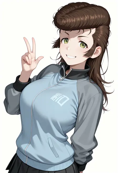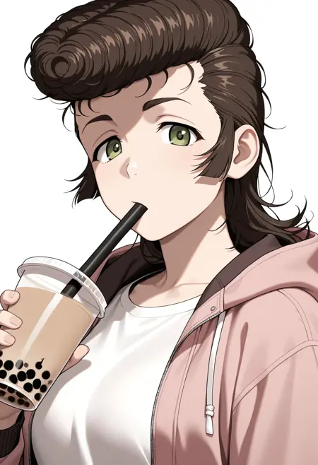 트리거: 1girl, 갈색 머리카락, 펌프두어, 긴 머리카락, 녹색 눈,