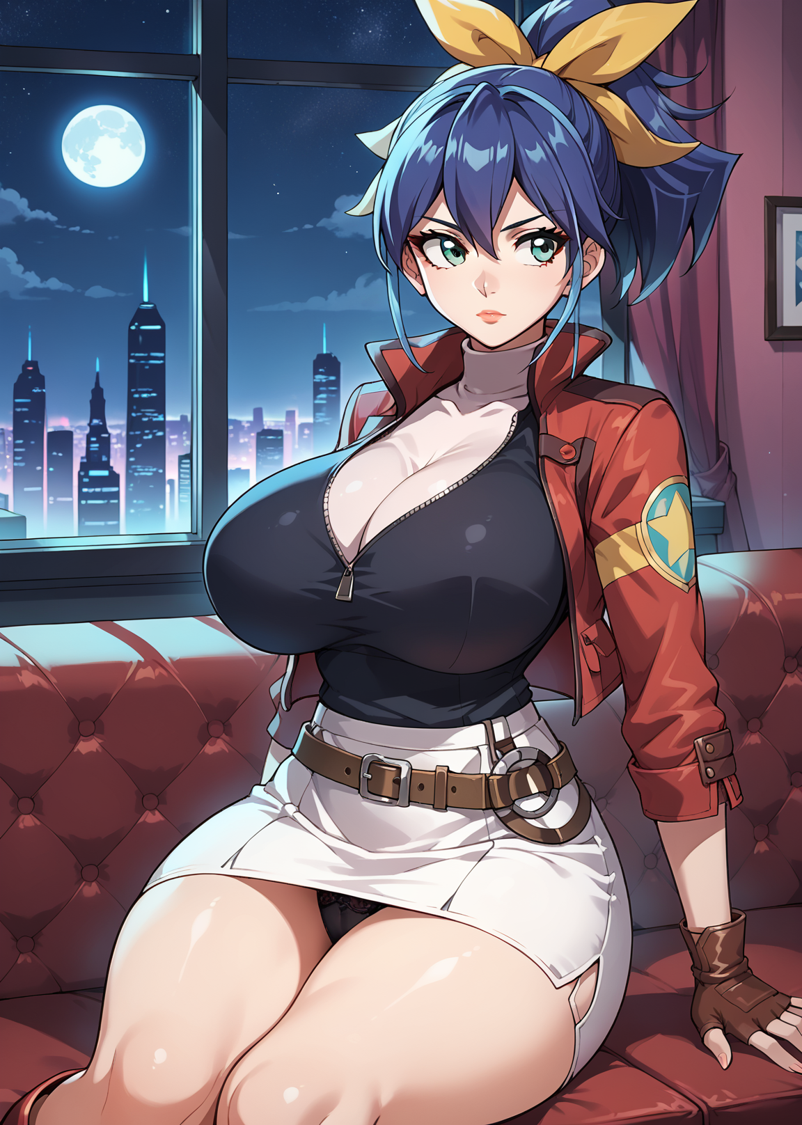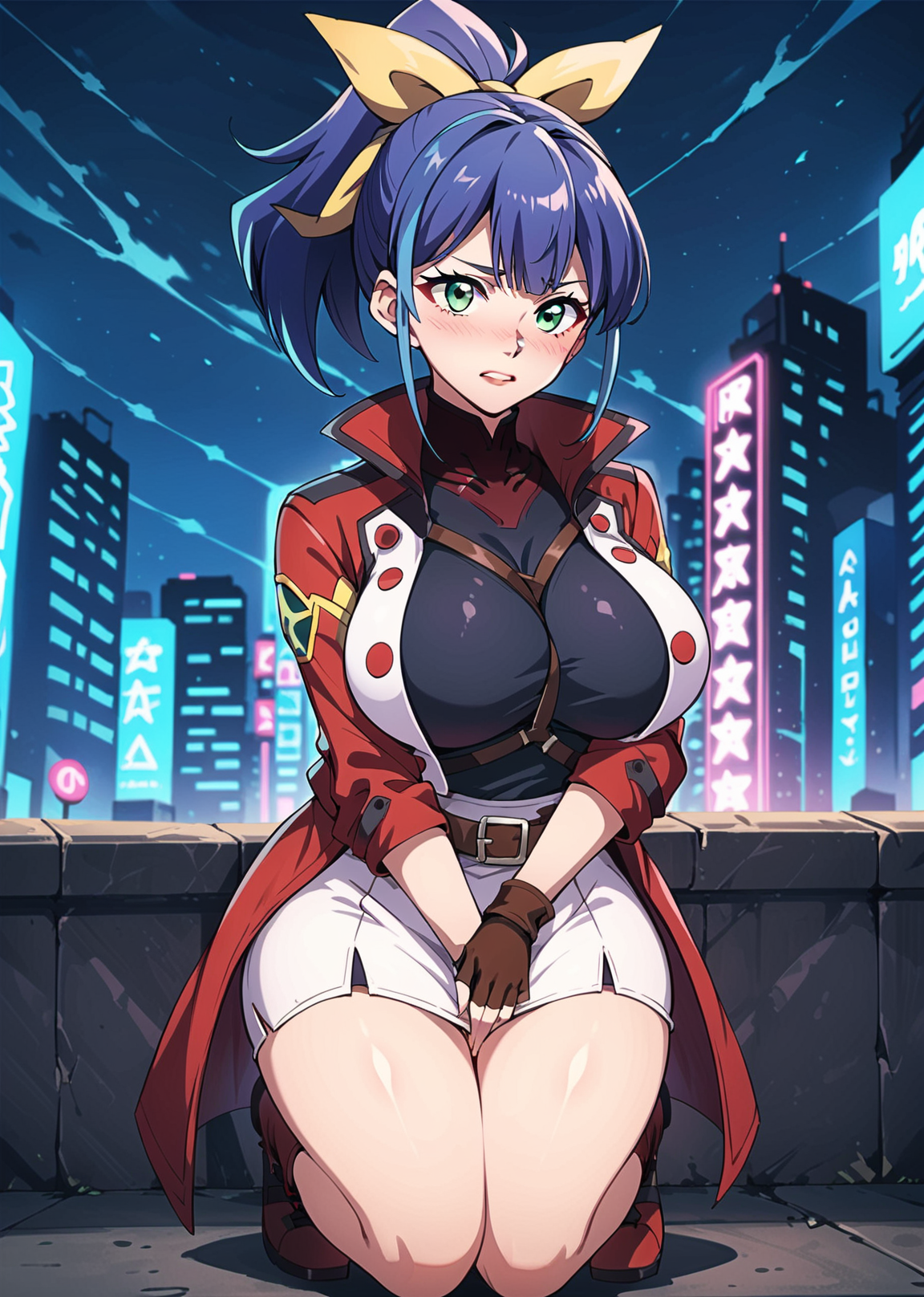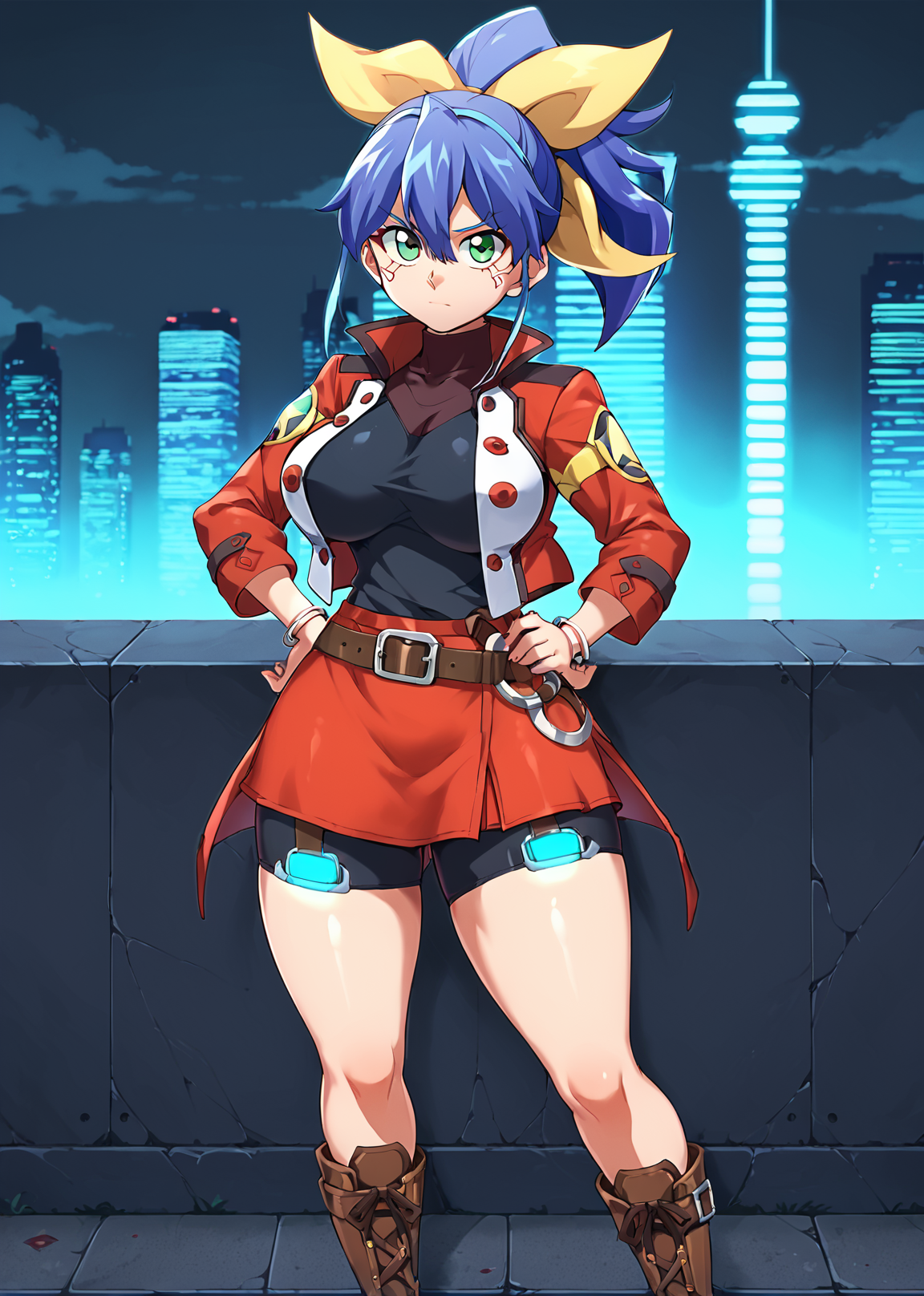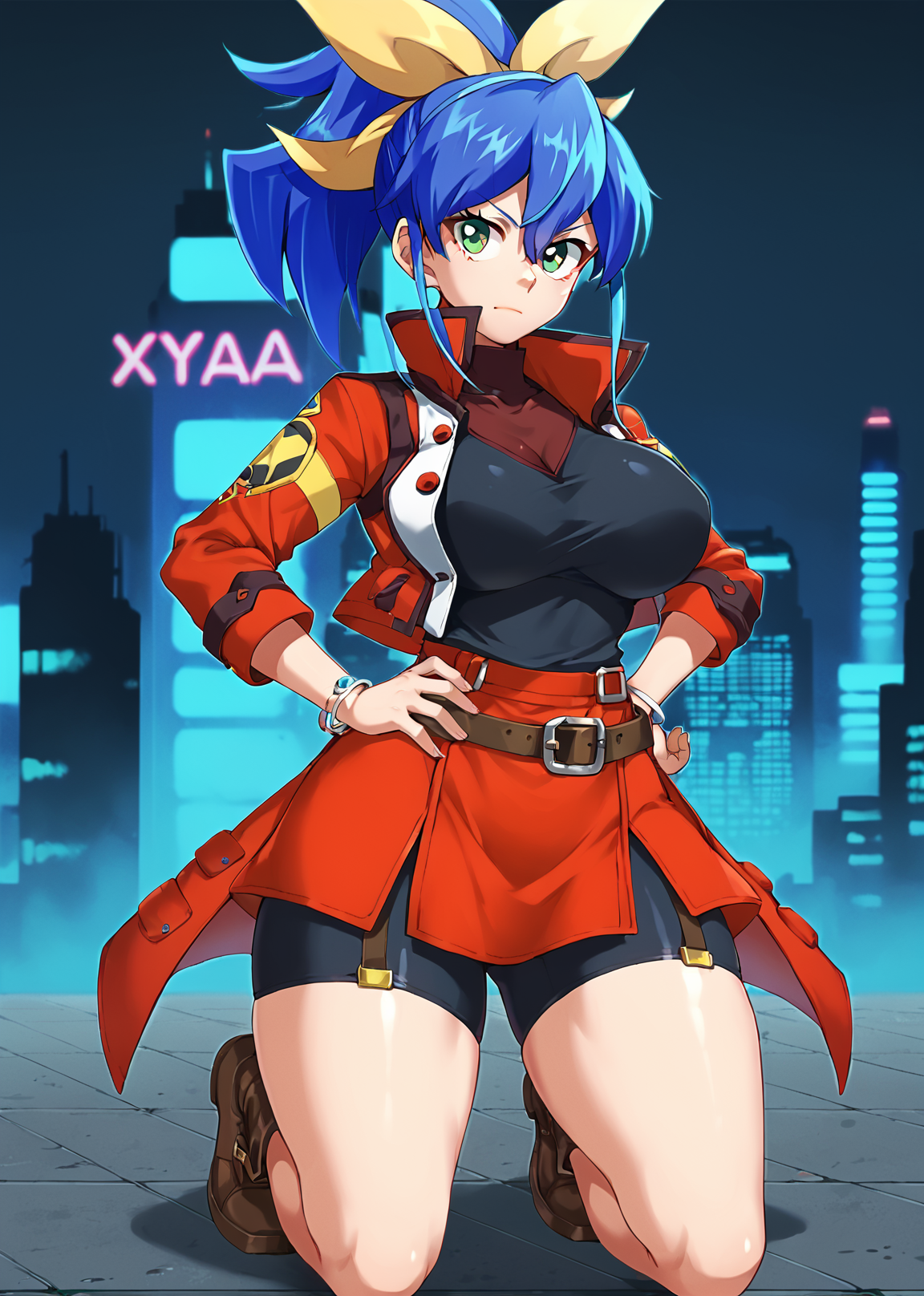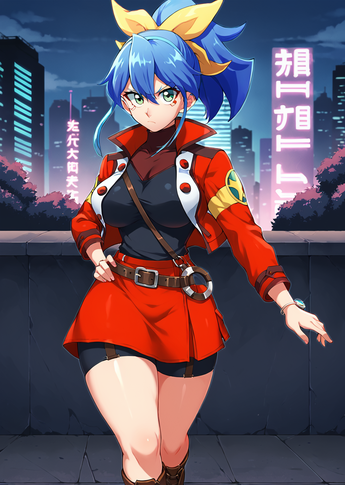 트리거 단어 (첫 번째 옷): 1girl, solo, 파란 머리, 토끼꼬리, 노란 리본, 검은 셔츠, 진한 빨간 터틀넥, 벨트, 빨간 재킷, 흰색 스트라이프, 빨간 단추, 갈색 벨트, 빨간 치마, 바이크 셔츠, 갈색 신발, 갈색 부츠, 손가락 없는 장갑