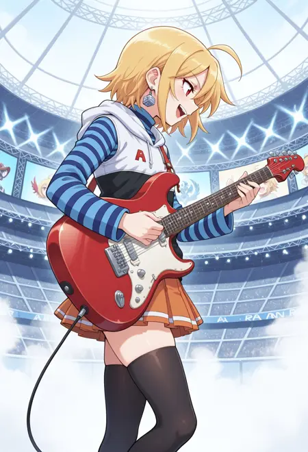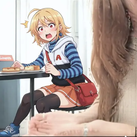 보석, 한쪽 귀걸이, 주사위 귀걸이, 파란 셔츠, 터틀넥, 줄무늬 셔츠, 긴 소매 셔츠, 투톤 후드티, 흰색 후드티, 검은색 후드티, 소매 없는 후드티, 후드 아래로, 어깨 끈, 빨간 가방, 어깨가방, 주황색 치마, 미니 스커트, 주름 스커트, 흰색 줄무늬 스커트, 검은색 허벅지 양말, 파란 신발, 스니커즈