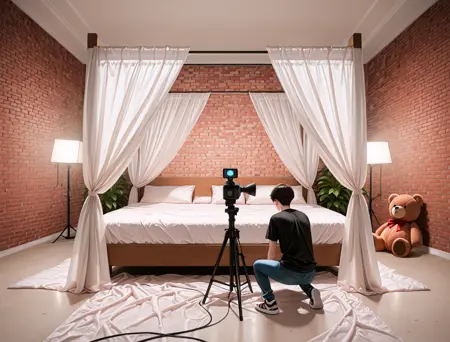 基本 :p_v_s_stud10,Porn video shooting studio, cinematic lighting, Pillow, Silk sheets, bed, Brick Wallpaper, houseplants, strong spotlights, Rail-mounted lighting, (((two large softboxes:1.4))), Two fixed lights, canopy bed, white sheer curtains,