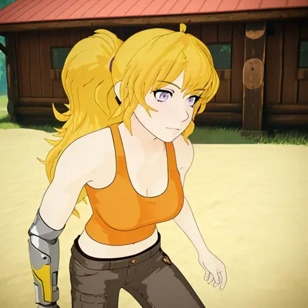 • 触发词:YangRWBYSeason3, 1girl, yang xiao long, 金发, 长发, 中等胸部, 胸部显露, 无指手套, 紫色眼睛, 露脐, 脐孔, 围巾, 护腕, 腰带, 短裤, 牛仔构图