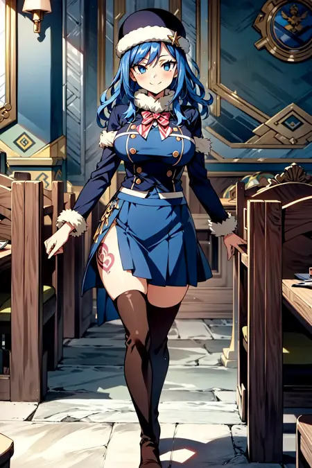 朱比亚·洛克撒,蓝发,蓝眼睛,长发,头发遮住眼睛,帽子,蓝眼睛,腰带,裙子,靴子,毛皮镶边,蓝色裙子,长袖,星星(符号),小斗篷,蓝色头饰