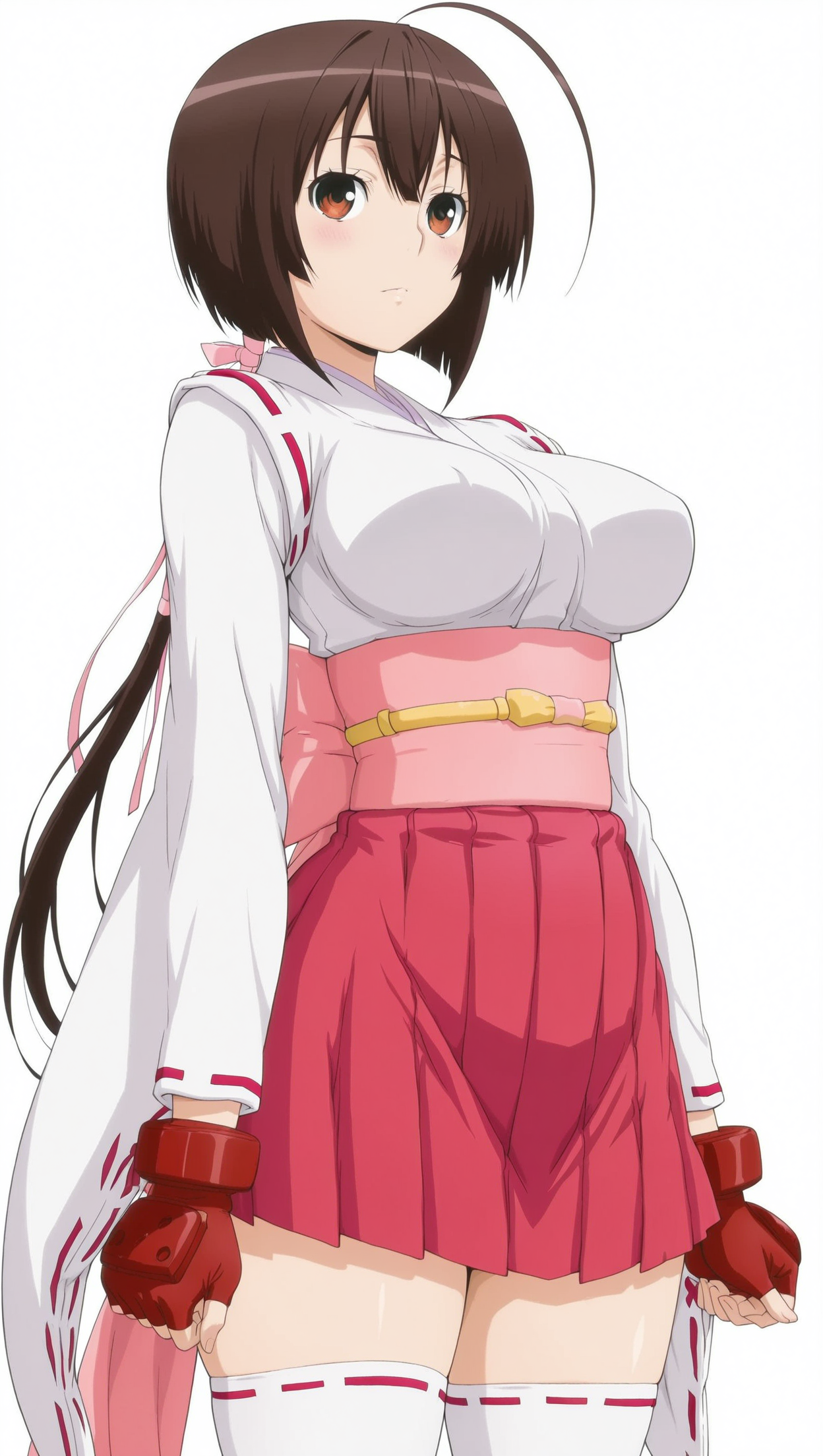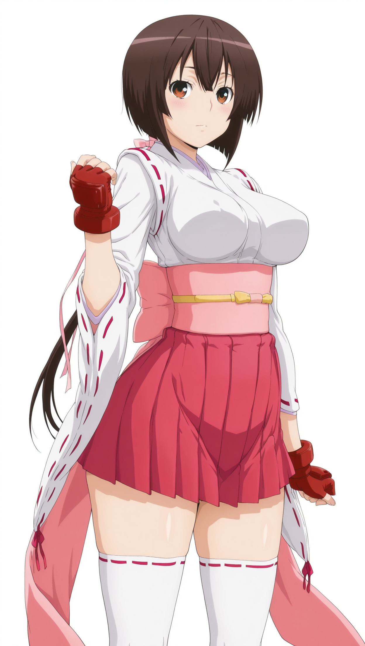 ((anime coloring)), masterpiece, best quality, amazing quality, musubi, 1girl, long hair, low ponytail, brown hair, brown eyes, medium breasts, hair ornament, japanese clothes, hakama, fingerless gloves, red gloves, obi, pink obi, thighhighs, white thighhighs, boots, cross-laced footwear, solo, pose, standing, looking at viewer, from front, ((((white background, simple background))))