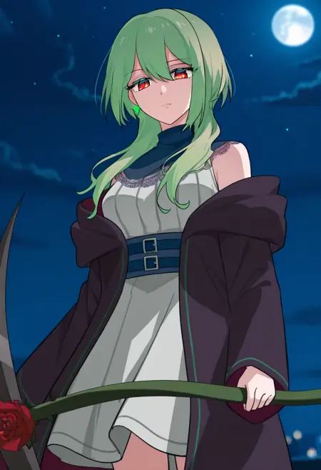 귀걸이, 보석, 검은 로브, 긴 소매, 흰 드레스, 벨트, 어깨 노출, 빨간 장미가 달린 낫,