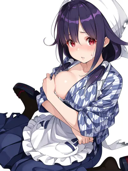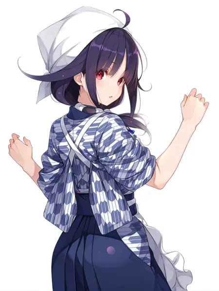 옷차림: ・t_clothes,head scarf,yagasuri,kimono,fish print,long_sleeves,white apron,blue hakama skirt,sandals,