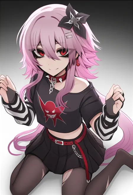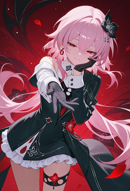 外見: 非常に長い髪、ピンクの髪、目の間の髪、ヘアクリップ、髪の花、黒い花、赤い目